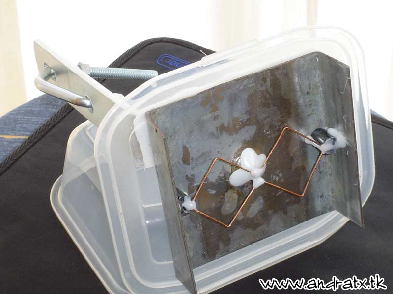 Antena Biquad casera vista por delante, sin la carcasa de protección.